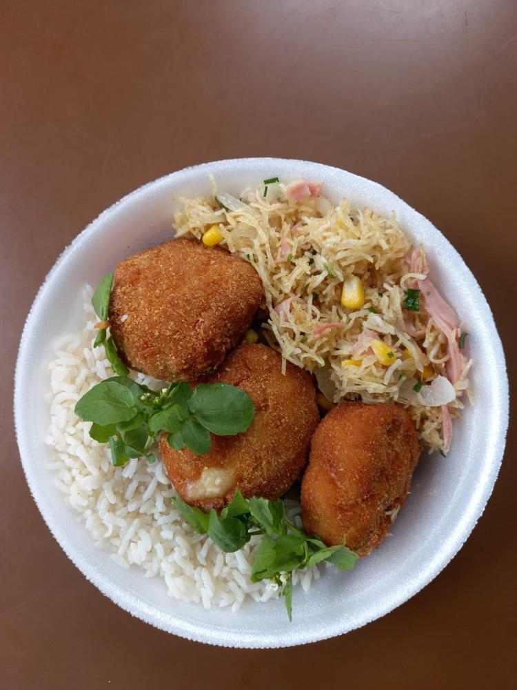 Acompanha: Duas unidade de escalope, Arroz a grega, Batata Francesa, Farofa e Maionese